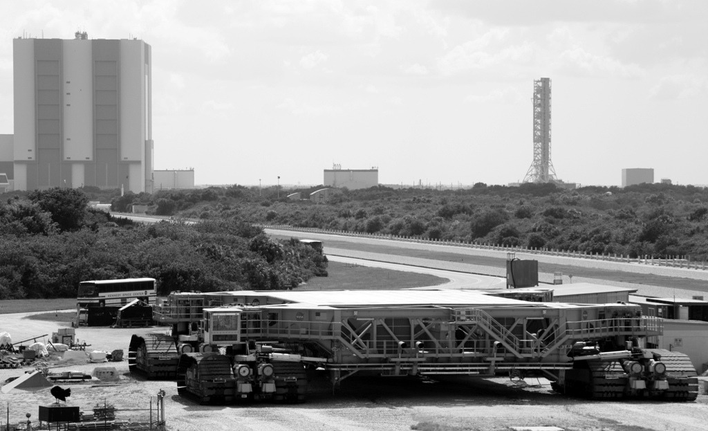 Im Hintergrund das Vehicle Assembly Building. Im Vordergrund einer der Crawler - Transporter.